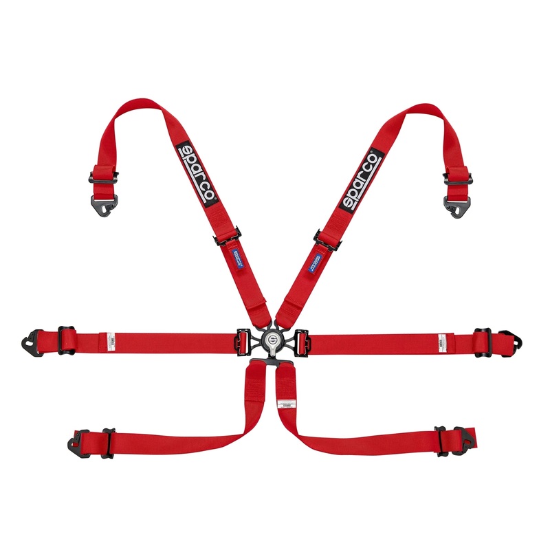Sparcos full line of harnesses works in unity with our competition seats. Crafted from high-quality fabric and fitted with durable fasteners, each harness restrains the body for added safety and protection. Our 6-point harness features 2-inch lap and shoulder straps that attach in the center using an aircraft-quality quick-release buckle with integrated anti-submarine belts. The lightweight steel adjusters allow for smooth, quick adjustments and perfect clamping. Each belt attaches to the frame using snap-on fixings. Available in pull down lap belts and in three colors each: black, blue and red.
