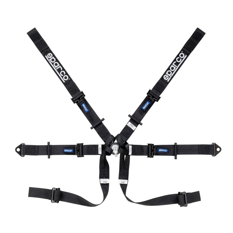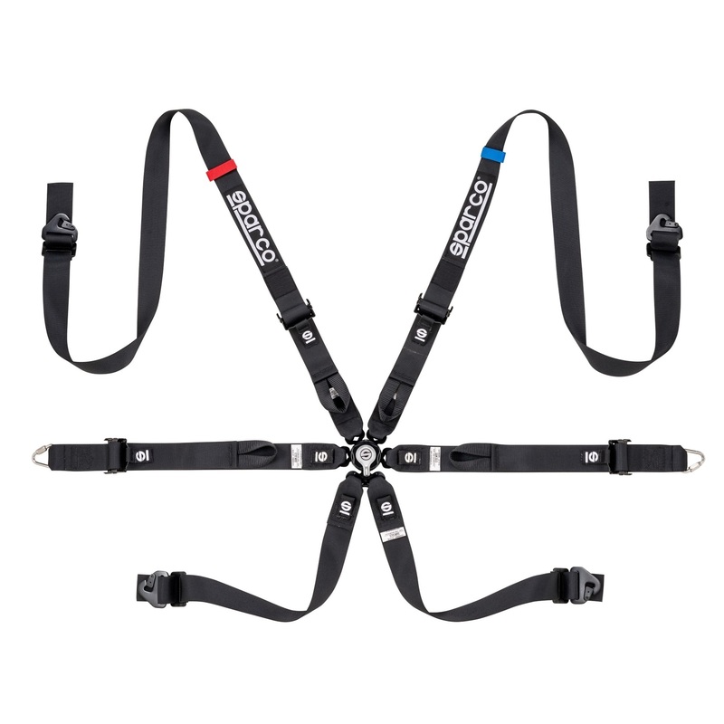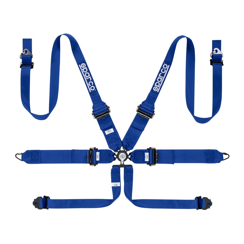 Sparcos full line of harnesses works in unity with our competition seats. Crafted from high-quality fabric and fitted with durable fasteners, each harness restrains the body for added safety and protection. Our 6-point Hans-compatible harness features 3-inch lap straps and shoulder straps that taper from 3 inches to 2 inches. This tapered design allows for the integration of a Hans device. Each strap attaches in the center using an aircraft-quality quick-release buckle with integrated anti-submarine belts. The lightweight aluminum adjusters allow for smooth, quick adjustments and perfect clamping. Shoulder and sub belts attaches to the frame using snap-on fixings and Carabiner fasteners for lap belts. Available in three colors: black, blue and red. This harness is FIA approved.