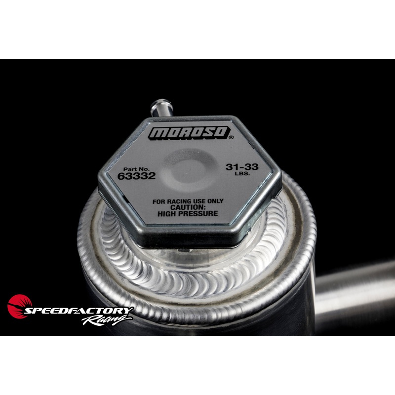 Each SpeedFactory Cooling System Fill Pot includes a Moroso 31-33LB radiator cap; which will add a significant amount of cooling efficiency to your car – especially for hot Summer track days. The increased coolant pressure via the Moroso cap raises the boiling point of your cooling system, which can give you some extra insurance against engine failure or detonation in extreme conditions.