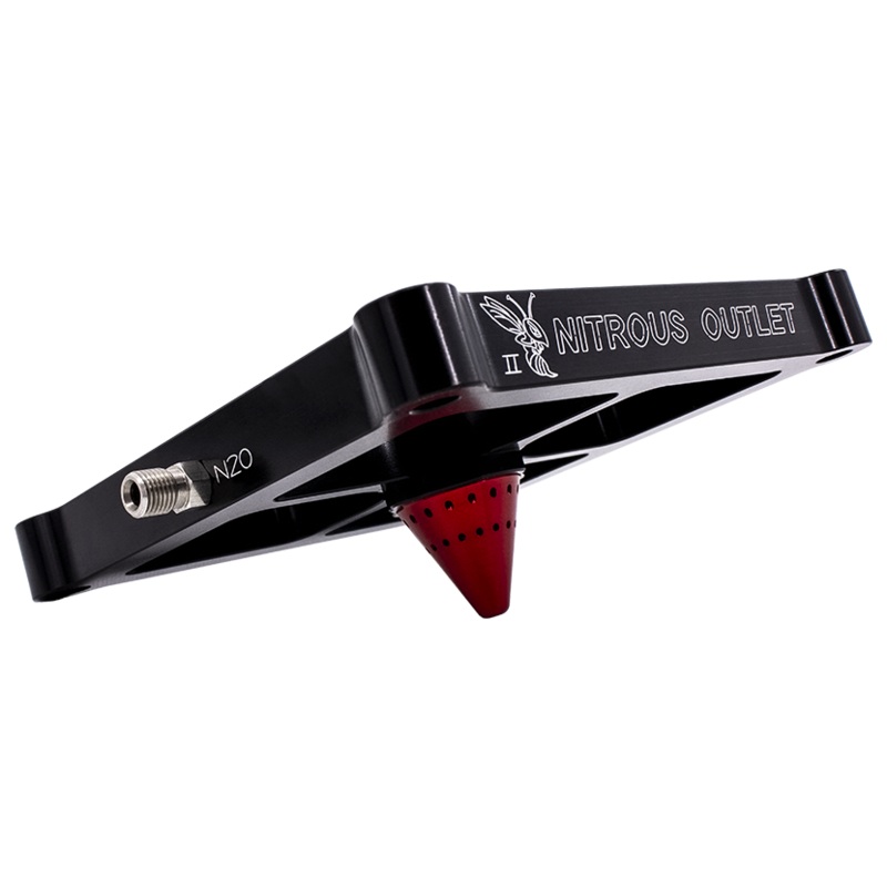 The 4500 plate and cone are manufactured from 6061 billet aluminum. The nitrous plate is .75 thick and black anodized with engraved Nitrous Outlet logos and Fuel / N2O entry marking. The cone is anodized red and features 16 nitrous discharge holes and 16 fuel discharge holes. Premium gaskets are included as well as Jetting for 50-100-150-200-250-300-350-400-450-500-550-600 horsepower shots.