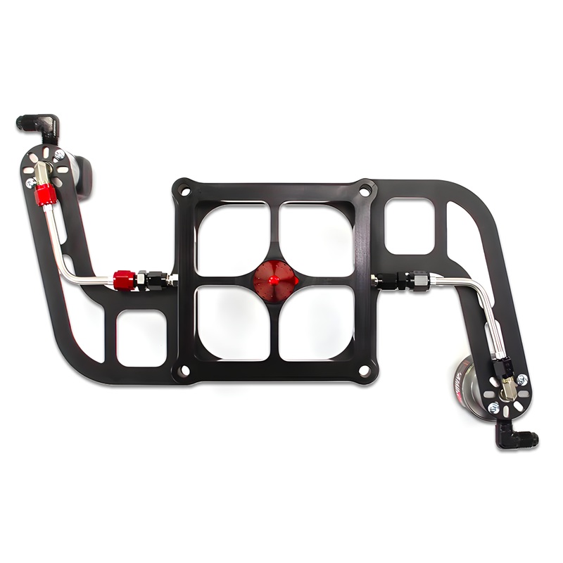 The 4500 plate and cone are manufactured from 6061 billet aluminum. The nitrous plate is .75 thick and black anodized with engraved Nitrous Outlet logos and Fuel / N2O entry marking. The cone is anodized red and features 16 nitrous discharge holes and 16 fuel discharge holes. Premium gaskets are included as well as Jetting for 50-100-150-200-250-300-350-400-450-500-550-600 horsepower shots. We even include fuel jetting for gasoline and E85! This is a race system and utilizes a .178 nitrous solenoid and .310 fuel solenoid. Custom bent stainless hard lines are included to connect the solenoids to the plate, as is our popular Boomerang Solenoid Bracket.