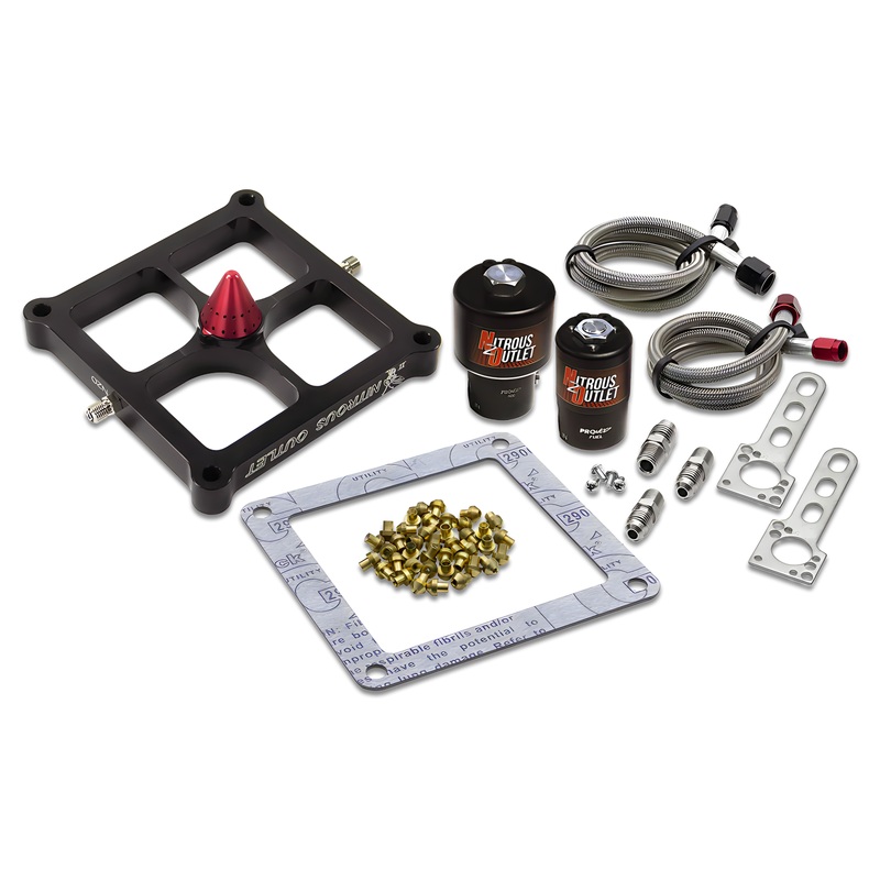 The 4500 plate and cone are manufactured from 6061 billet aluminum. The nitrous plate is .75 thick and black anodized with engraved Nitrous Outlet logos and Fuel / N2O entry marking. The cone is anodized red and features 16 nitrous discharge holes and 16 fuel discharge holes. Premium gaskets are included as well as Jetting for 50-100-150-200-250-300-350-400-450-500-550-600 horsepower shots. We even include fuel jetting for gasoline and E85! This is a race system and utilizes a .178 nitrous solenoid and .310 fuel solenoid. Braided stainless hoses are included to connect the solenoids to the plate, as are universal solenoid brackets.