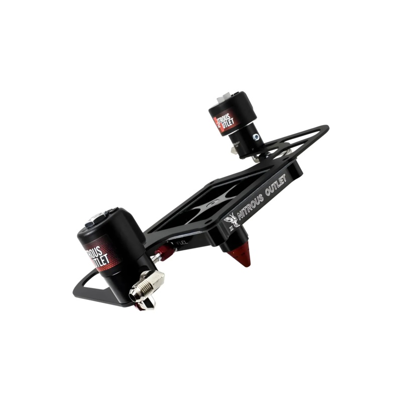 The 4500 plate and cone are manufactured from 6061 billet aluminum. The nitrous plate is .75 thick and black anodized with engraved Nitrous Outlet logos and Fuel / N2O entry marking. The cone is anodized red and features 16 nitrous discharge holes and 16 fuel discharge holes that discharge 1-7/8″ below the carb flange. Premium gaskets are included as well as Jetting for 50-100-150-200-250-300-350-400-450-500-550-600 horsepower shots. We even include fuel jetting for gasoline and E85! This is a race system and utilizes a .178 nitrous solenoid and .310 fuel solenoid. Custom bent stainless hard lines are included to connect the solenoids to the plate, as is our popular Boomerang Solenoid Bracket.