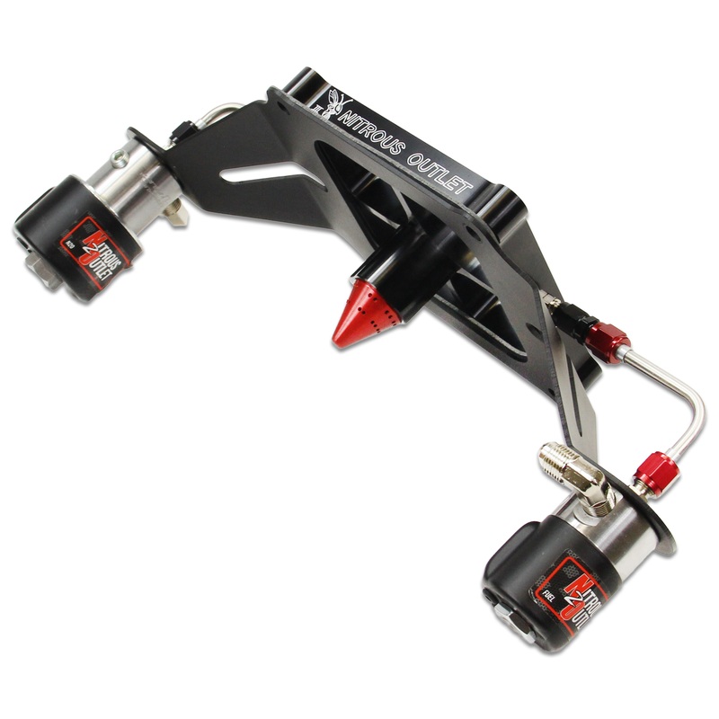 The Stinger plate is CNC machined from 6061 billet aluminum, has a black anodized body, red anodized stinger, and is CNC engraved with the Nitrous Outlet logo and fuel/nitrous ports.