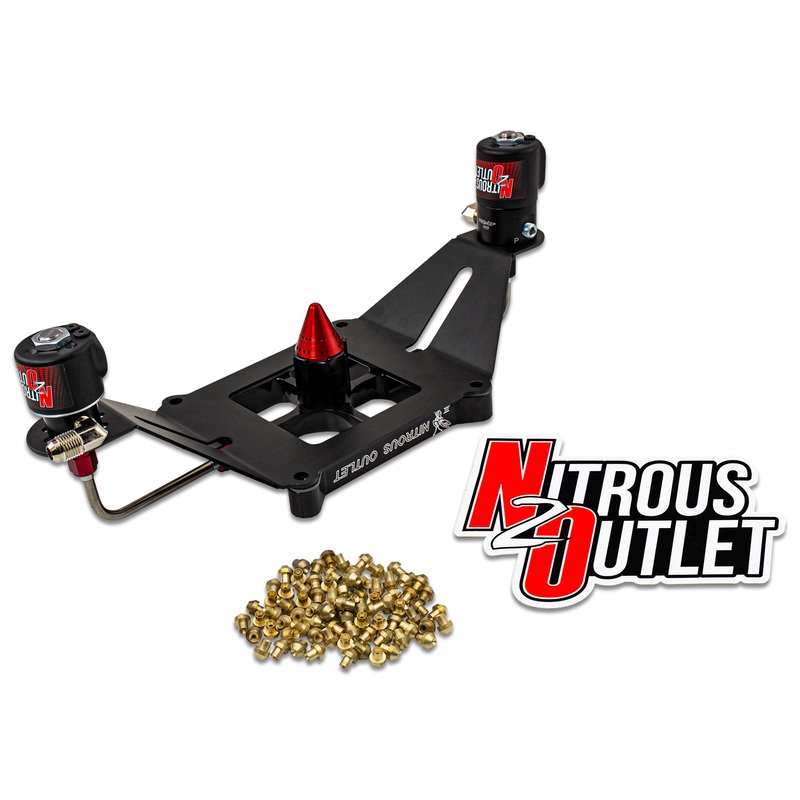 The 4150 plate and cone are manufactured from 6061 billet aluminum. The nitrous plate is .75 thick and black anodized with engraved Nitrous Outlet logos and Fuel / N2O entry marking. The cone is anodized red and features 16 nitrous discharge holes and 16 fuel discharge holes that discharge 1-7/8″ below the carb flange. Premium gaskets are included as well as Jetting for 50-100-150-200-250-300-350-400-450-500 horsepower shots. We even include fuel jetting for gasoline and E85! This is a standard system and utilizes a .122 nitrous solenoid and .177 fuel solenoid. Custom bent stainless hard lines are included to connect the solenoids to the plate, as is our Deep BreakSolenoid Bracket.