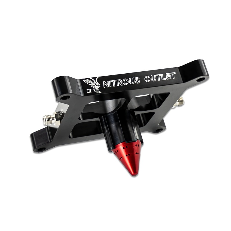 The 4500 plate and cone are manufactured from 6061 billet aluminum. The nitrous plate is .75 thick and black anodized with engraved Nitrous Outlet logos and Fuel / N2O entry marking. The cone is anodized red and features 16 nitrous discharge holes and 16 fuel discharge holes that discharge 1-7/8″ below the carb flange. Premium gaskets are included as well as Jetting for 50-100-150-200-250-300-350-400-450-500 horsepower shots. We even include fuel jetting for gasoline and E85! This is a standard system and utilizes a .122 nitrous solenoid and .177 fuel solenoid. Custom bent stainless hard lines are included to connect the solenoids to the plate, as is our Deep BreakSolenoid Bracket.