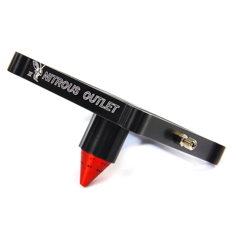 The 4500 plate and cone are manufactured from 6061 billet aluminum. The nitrous plate is .75 thick and black anodized with engraved Nitrous Outlet logos and Fuel / N2O entry marking. The cone is anodized red and features 16 nitrous discharge holes and 16 fuel discharge holes that discharge 1-7/8″ below the carb flange. Premium gaskets are included as well as Jetting for 50-100-150-200-250-300-350-400-450-500 horsepower shots. We even include fuel jetting for gasoline and E85! This is a standard system and utilizes a .122 nitrous solenoid and .177 fuel solenoid. Braided stainless hoses are included to connect the solenoids to the plate, as are universal solenoid brackets.