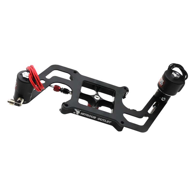The 4150 plate and cone are manufactured from 6061 billet aluminum. The nitrous plate is .75 thick and black anodized with engraved Nitrous Outlet logos and Fuel / N2O entry marking. The cone is anodized red and features 16 nitrous discharge holes and 16 fuel discharge holes. Premium gaskets are included as well as Jetting for 50-100-150-200-250-300-350-400-450-500-550-600 horsepower shots. We even include fuel jetting for gasoline and E85 for 5, 7, 10, 45, and 55psi fuel pressures!This is a race solenoids forward plate conversion and utilizes a .178 nitrous solenoid and a.310 fuel solenoid. This solenoids-forward conversion comes with our Boomerang Solenoid Bracket and pre-bent hardlines for the cleanest installation around.