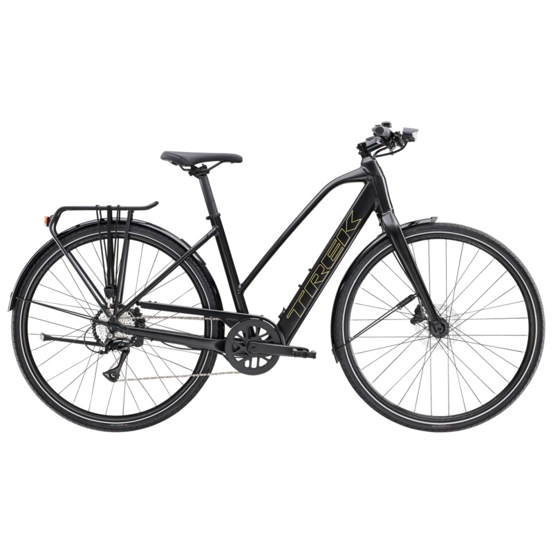 A lightweight aluminium frame and fork, Trek’s proprietary pedal assist system by Hyena with a hub motor (250 W, 40 Nm) that assists up to 20 mph (25 km/h in Europe) and a 250 Wh battery for a range of up to 35 miles (55 kilometres) per charge. Plus, fast 700c wheels, fast-rolling yet stable 40c tyres with reflective sidewalls, a reliable 8-speed Shimano drivetrain, hydraulic disc brakes, integrated lights powered by the battery, an MIK-compatible rear rack, mudguards and a kickstand.