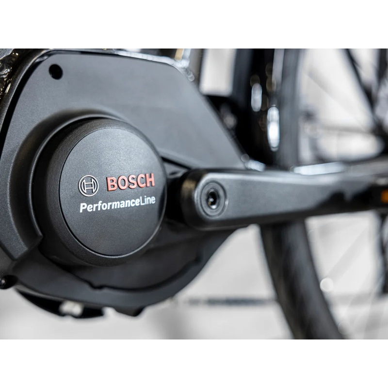 A lightweight Alpha Smooth aluminium frame with a stagger geometry, a Bosch Performance Line Cruise (250 W, 65 Nm) motor capable of sustaining speeds up to 25 km/h, your choice of a 300 Wh, 400 Wh or 500 Wh battery, and a Bosch Intuvia controller. Plus, a 9-speed Shimano drivetrain, hydraulic disc brakes for all-weather stopping power, a suspension fork and seatpost, wide puncture-resistant tyres for extra stability, ergonomic grips, a kickstand, front and rear lights, a lock and a MIK rear rack and mudguards.