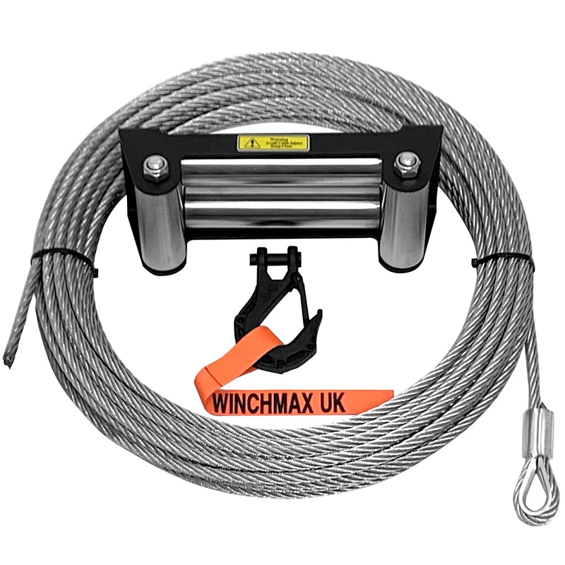 Steel Rope 26m x 9.5mm, Hole Fix. Roller Fairlead. 3/8 inch Tactical Hook. For winches up to 13,500lb.